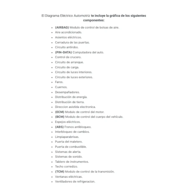 El Diagrama Eléctrico Automotriz te incluye la gráfica de los siguientes componentes: