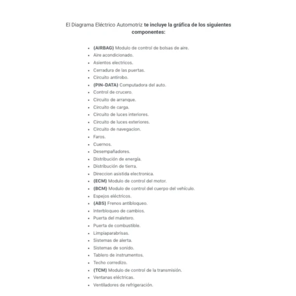 El Diagrama Eléctrico Automotriz te incluye la gráfica de los siguientes componentes: