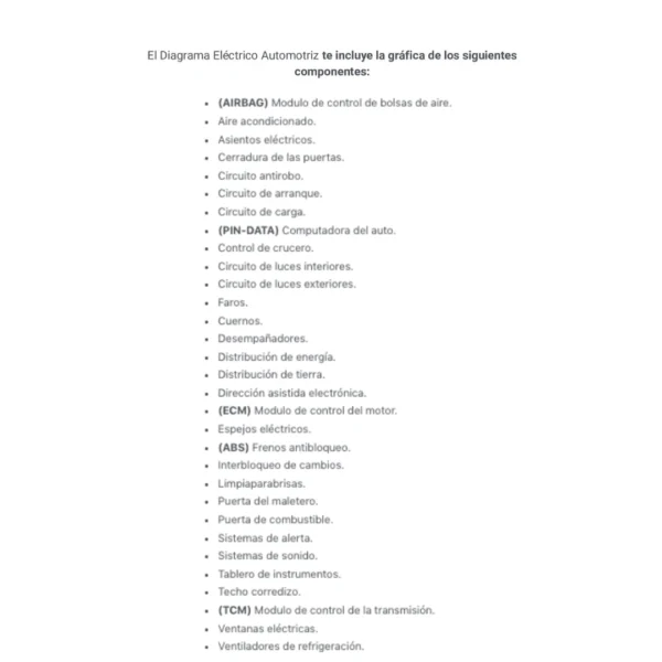 El Diagrama Eléctrico Automotriz te incluye la gráfica de los siguientes componentes:
