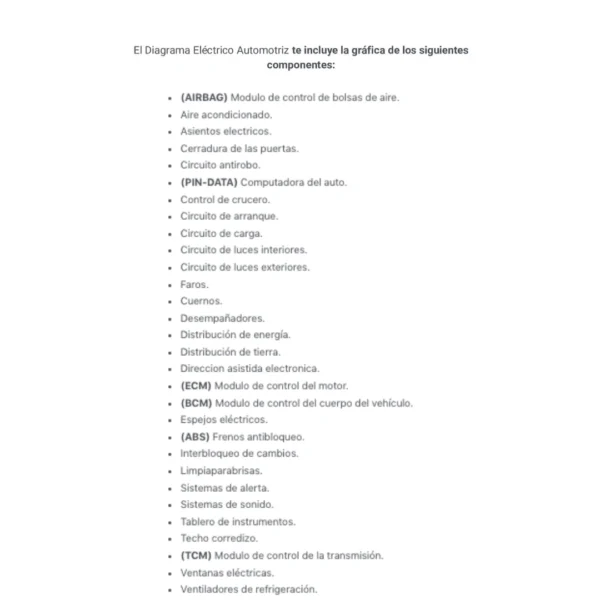 El Diagrama Eléctrico Automotriz te incluye la gráfica de los siguientes componentes: