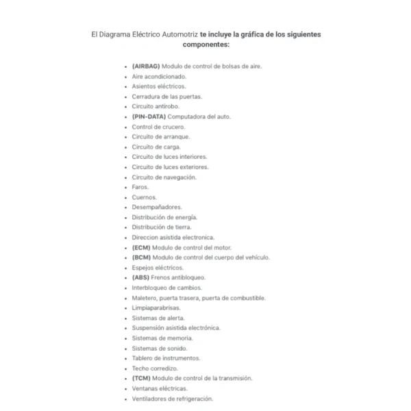 El Diagrama Eléctrico Automotriz te incluye la gráfica de los siguientes componentes: