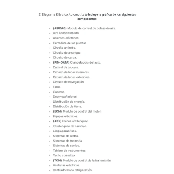 El Diagrama Eléctrico Automotriz te incluye la gráfica de los siguientes componentes: