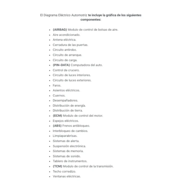 El Diagrama Eléctrico Automotriz te incluye la gráfica de los siguientes componentes: