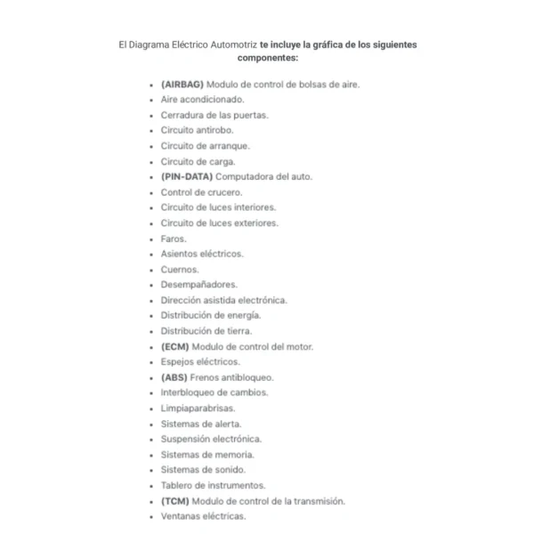 El Diagrama Eléctrico Automotriz te incluye la gráfica de los siguientes componentes: