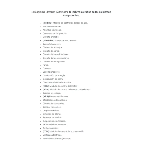 El Diagrama Eléctrico Automotriz te incluye la gráfica de los siguientes componentes: