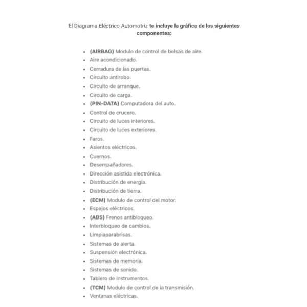 El Diagrama Eléctrico Automotriz te incluye la gráfica de los siguientes componentes: