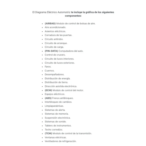 El Diagrama Eléctrico Automotriz te incluye la gráfica de los siguientes componentes: