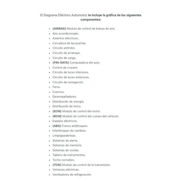 El Diagrama Eléctrico Automotriz te incluye la gráfica de los siguientes componentes: