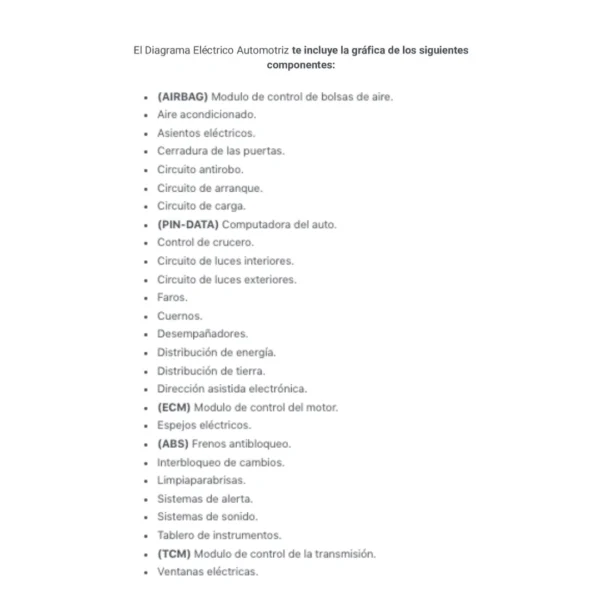 El Diagrama Eléctrico Automotriz te incluye la gráfica de los siguientes componentes: