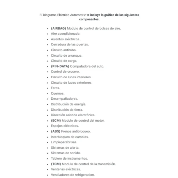 El Diagrama Eléctrico Automotriz te incluye la gráfica de los siguientes componentes: