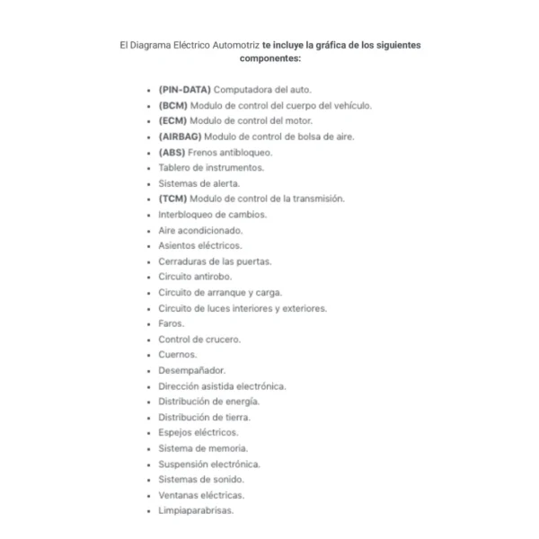 El Diagrama Eléctrico Automotriz te incluye la gráfica de los siguientes componentes: