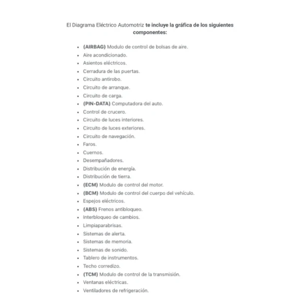El Diagrama Eléctrico Automotriz te incluye la gráfica de los siguientes componentes: