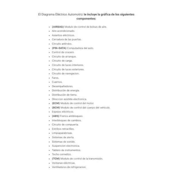 El Diagrama Eléctrico Automotriz te incluye la gráfica de los siguientes componentes: