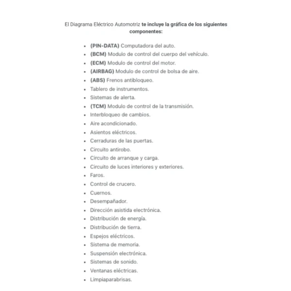 El Diagrama Eléctrico Automotriz te incluye la gráfica de los siguientes componentes: