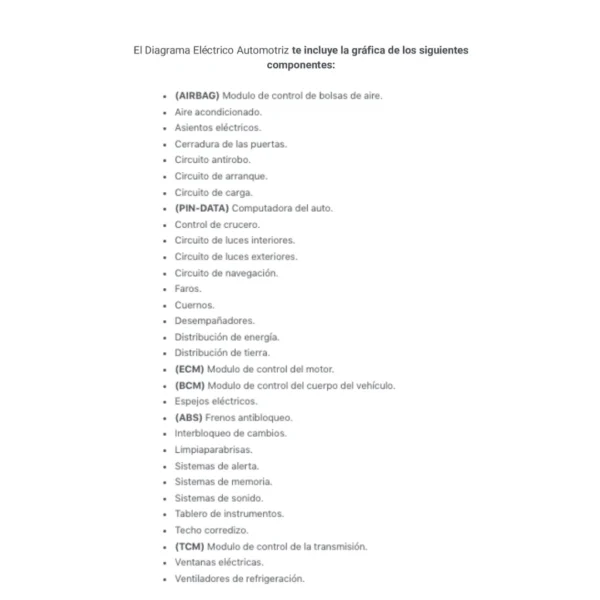 El Diagrama Eléctrico Automotriz te incluye la gráfica de los siguientes componentes: