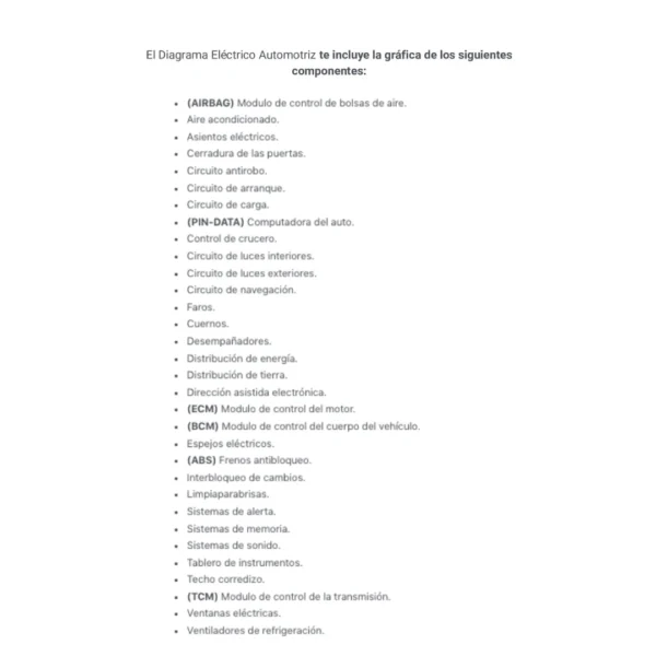 El Diagrama Eléctrico Automotriz te incluye la gráfica de los siguientes componentes: