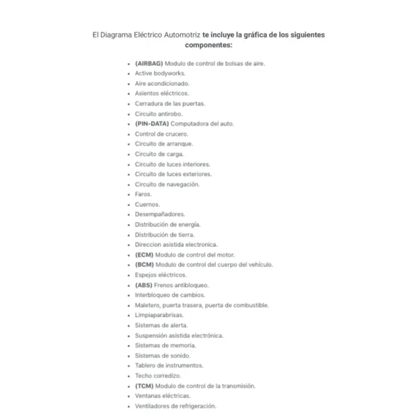 El Diagrama Eléctrico Automotriz te incluye la gráfica de los siguientes componentes: