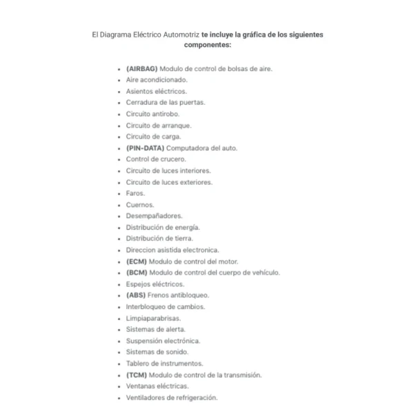 El Diagrama Eléctrico Automotriz te incluye la gráfica de los siguientes componentes: