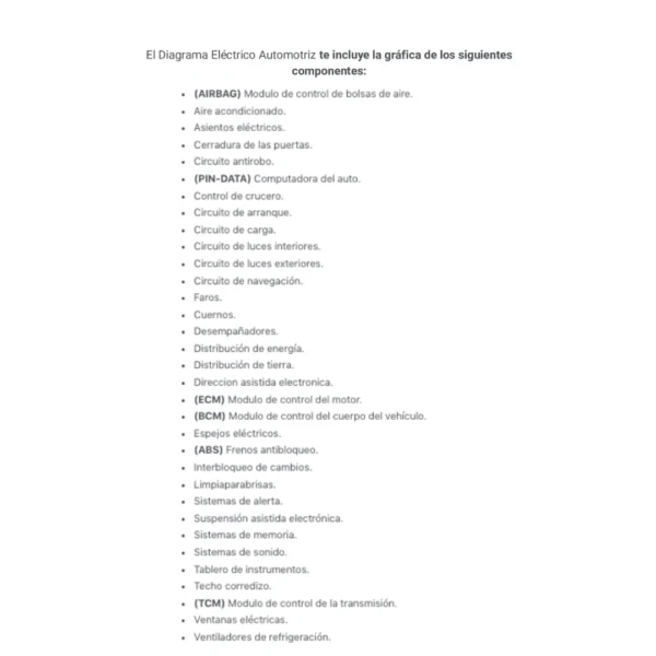 El Diagrama Eléctrico Automotriz te incluye la gráfica de los siguientes componentes: