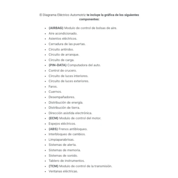 El Diagrama Eléctrico Automotriz te incluye la gráfica de los siguientes componentes: