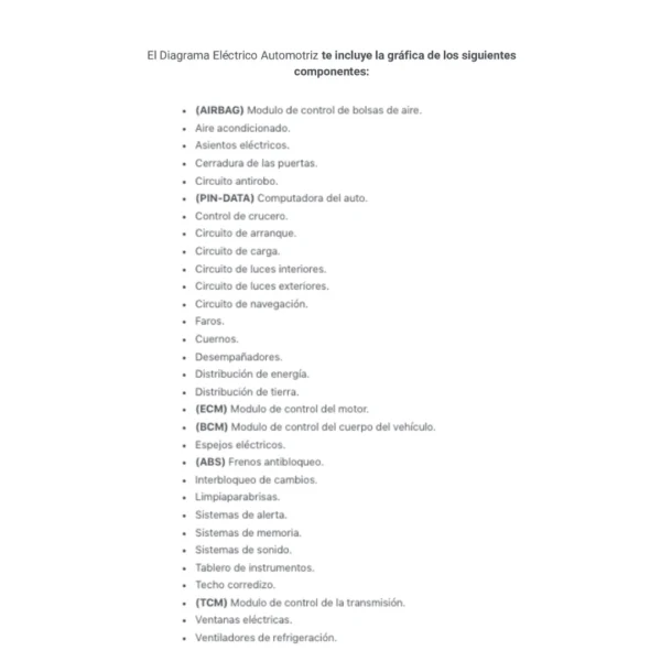 El Diagrama Eléctrico Automotriz te incluye la gráfica de los siguientes componentes: