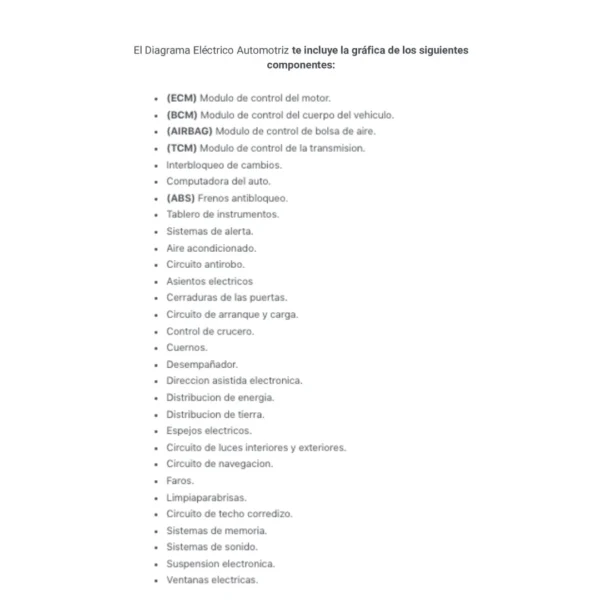 El Diagrama Eléctrico Automotriz te incluye la gráfica de los siguientes componentes: