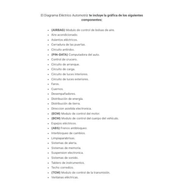 El Diagrama Eléctrico Automotriz te incluye la gráfica de los siguientes componentes: