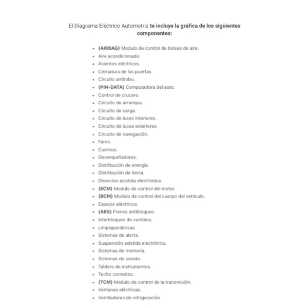 El Diagrama Eléctrico Automotriz te incluye la gráfica de los siguientes componentes:
