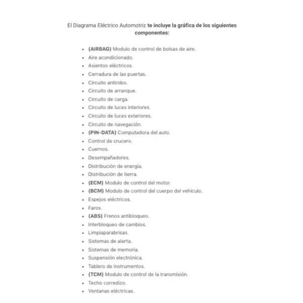 El Diagrama Eléctrico Automotriz te incluye la gráfica de los siguientes componentes: