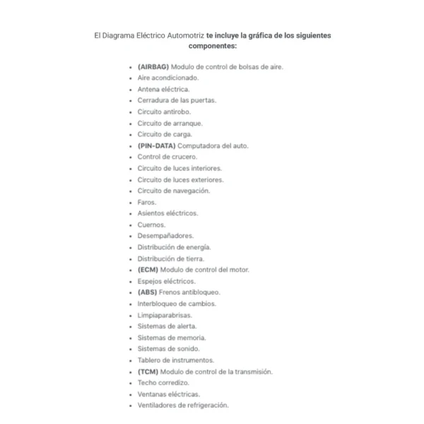El Diagrama Eléctrico Automotriz te incluye la gráfica de los siguientes componentes: