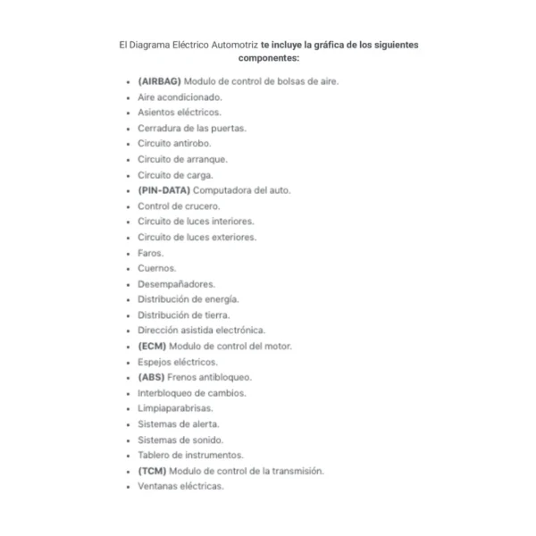 El Diagrama Eléctrico Automotriz te incluye la gráfica de los siguientes componentes: