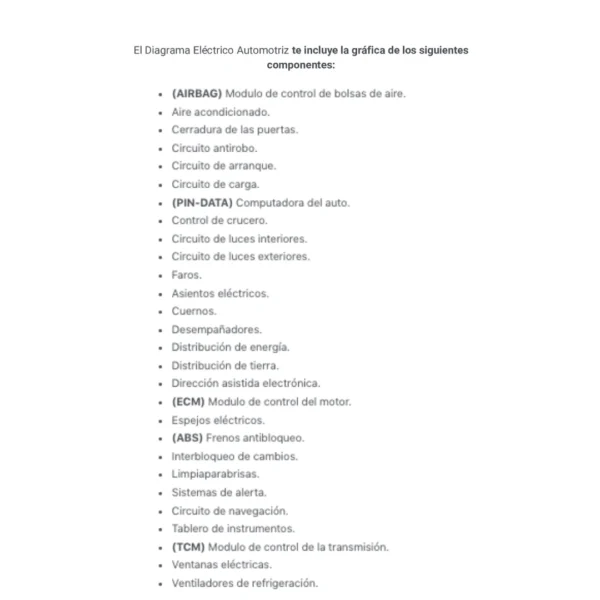 El Diagrama Eléctrico Automotriz te incluye la gráfica de los siguientes componentes: