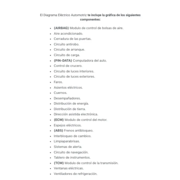 El Diagrama Eléctrico Automotriz te incluye la gráfica de los siguientes componentes: