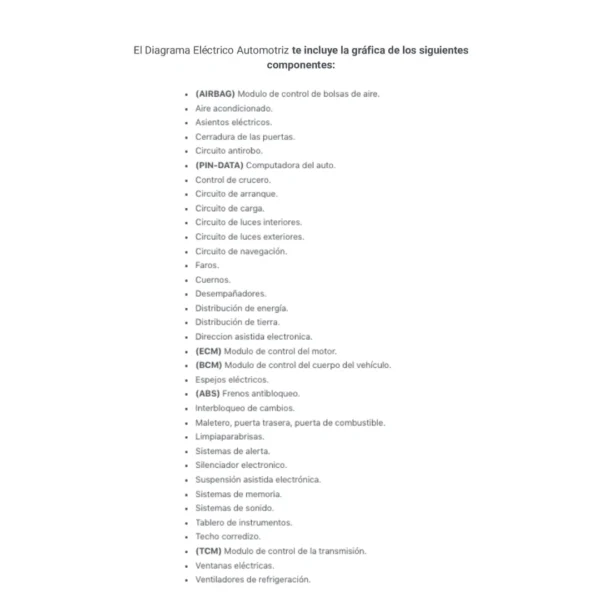El Diagrama Eléctrico Automotriz te incluye la gráfica de los siguientes componentes: