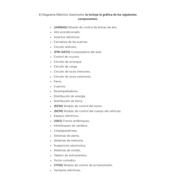 El Diagrama Eléctrico Automotriz te incluye la gráfica de los siguientes componentes: