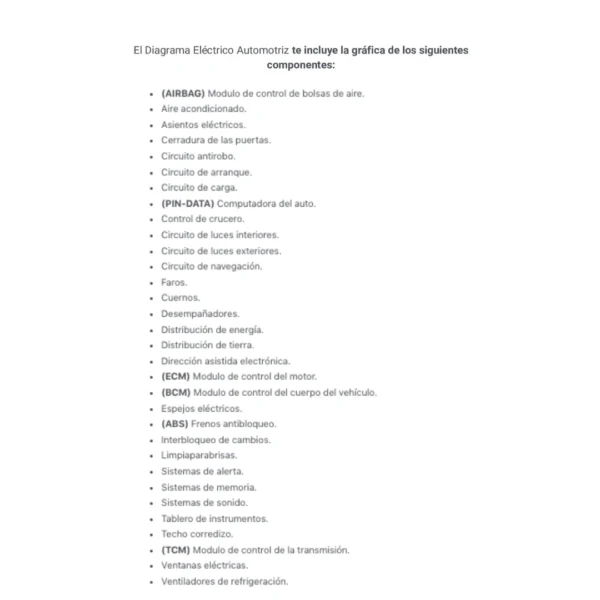 El Diagrama Eléctrico Automotriz te incluye la gráfica de los siguientes componentes: