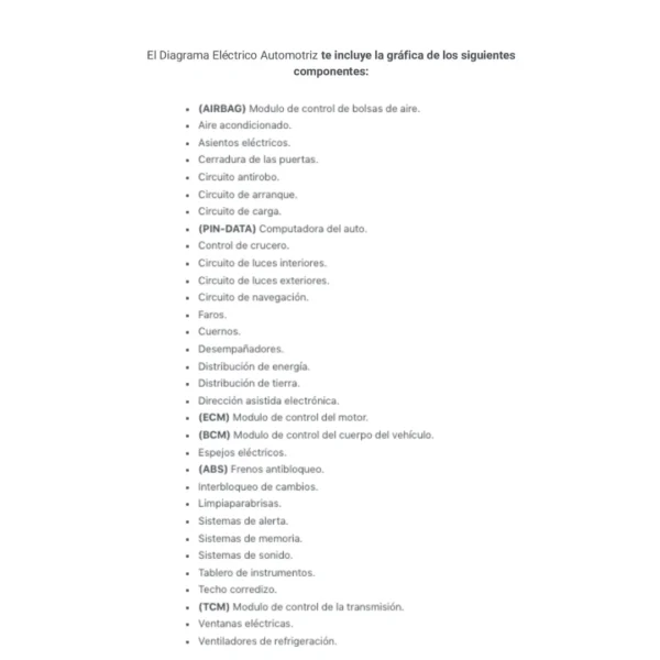 El Diagrama Eléctrico Automotriz te incluye la gráfica de los siguientes componentes:
