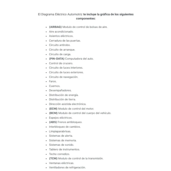 El Diagrama Eléctrico Automotriz te incluye la gráfica de los siguientes componentes: