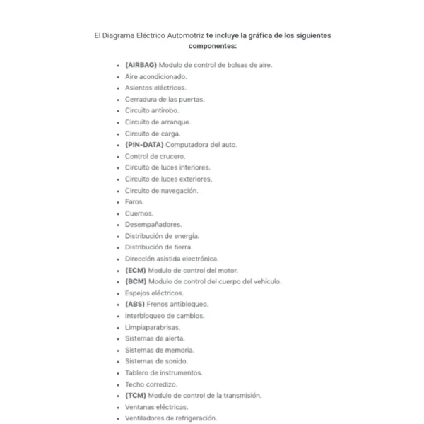 El Diagrama Eléctrico Automotriz te incluye la gráfica de los siguientes componentes: