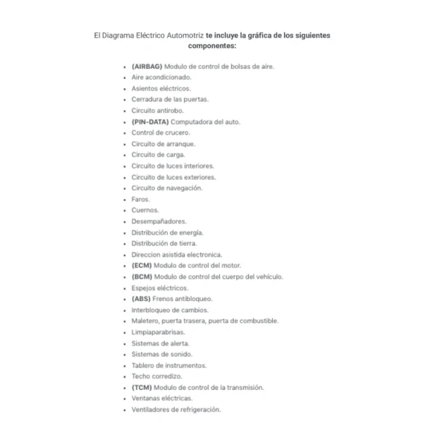 El Diagrama Eléctrico Automotriz te incluye la gráfica de los siguientes componentes: