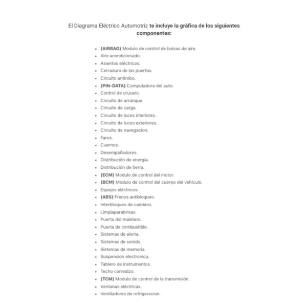 El Diagrama Eléctrico Automotriz te incluye la gráfica de los siguientes componentes: