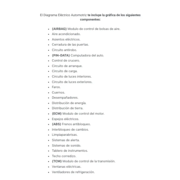 El Diagrama Eléctrico Automotriz te incluye la gráfica de los siguientes componentes: