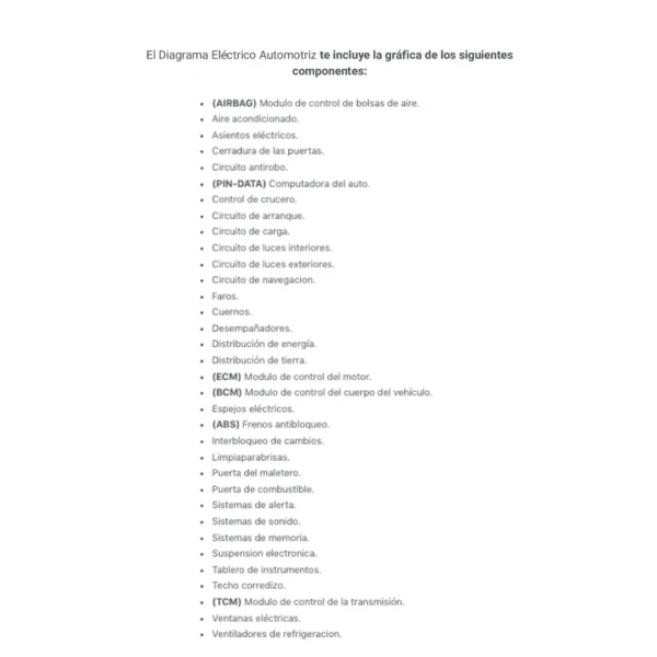 El Diagrama Eléctrico Automotriz te incluye la gráfica de los siguientes componentes: