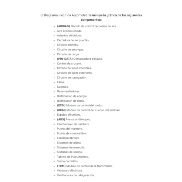 El Diagrama Eléctrico Automotriz te incluye la gráfica de los siguientes componentes: