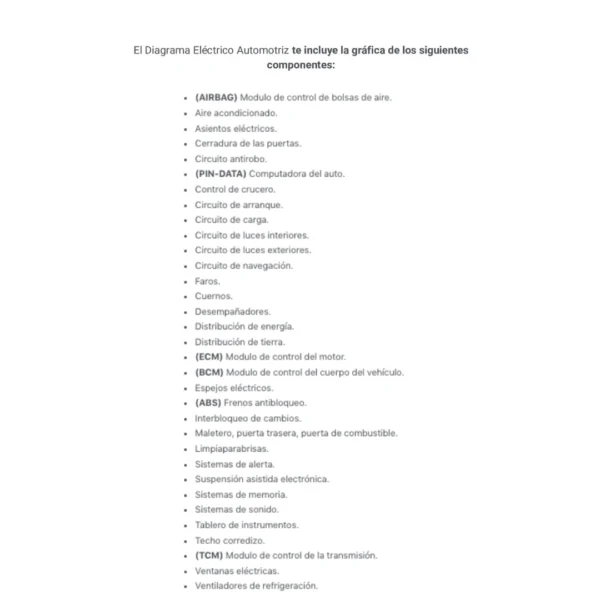El Diagrama Eléctrico Automotriz te incluye la gráfica de los siguientes componentes: