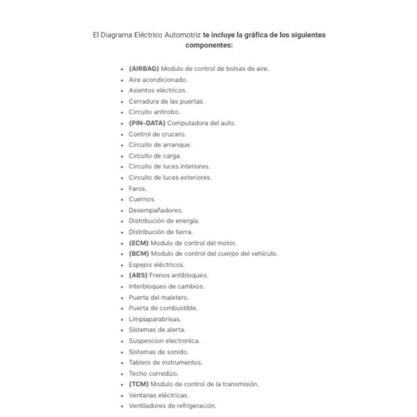 El Diagrama Eléctrico Automotriz te incluye la gráfica de los siguientes componentes: