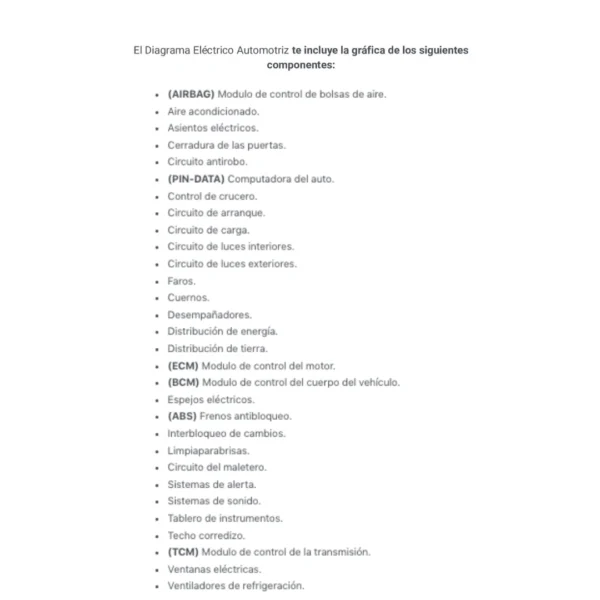 El Diagrama Eléctrico Automotriz te incluye la gráfica de los siguientes componentes: