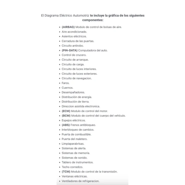 El Diagrama Eléctrico Automotriz te incluye la gráfica de los siguientes componentes: