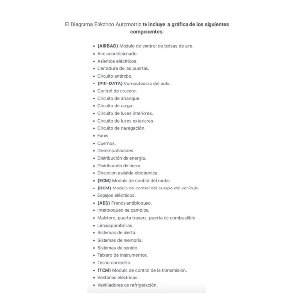 El Diagrama Eléctrico Automotriz te incluye la gráfica de los siguientes componentes: