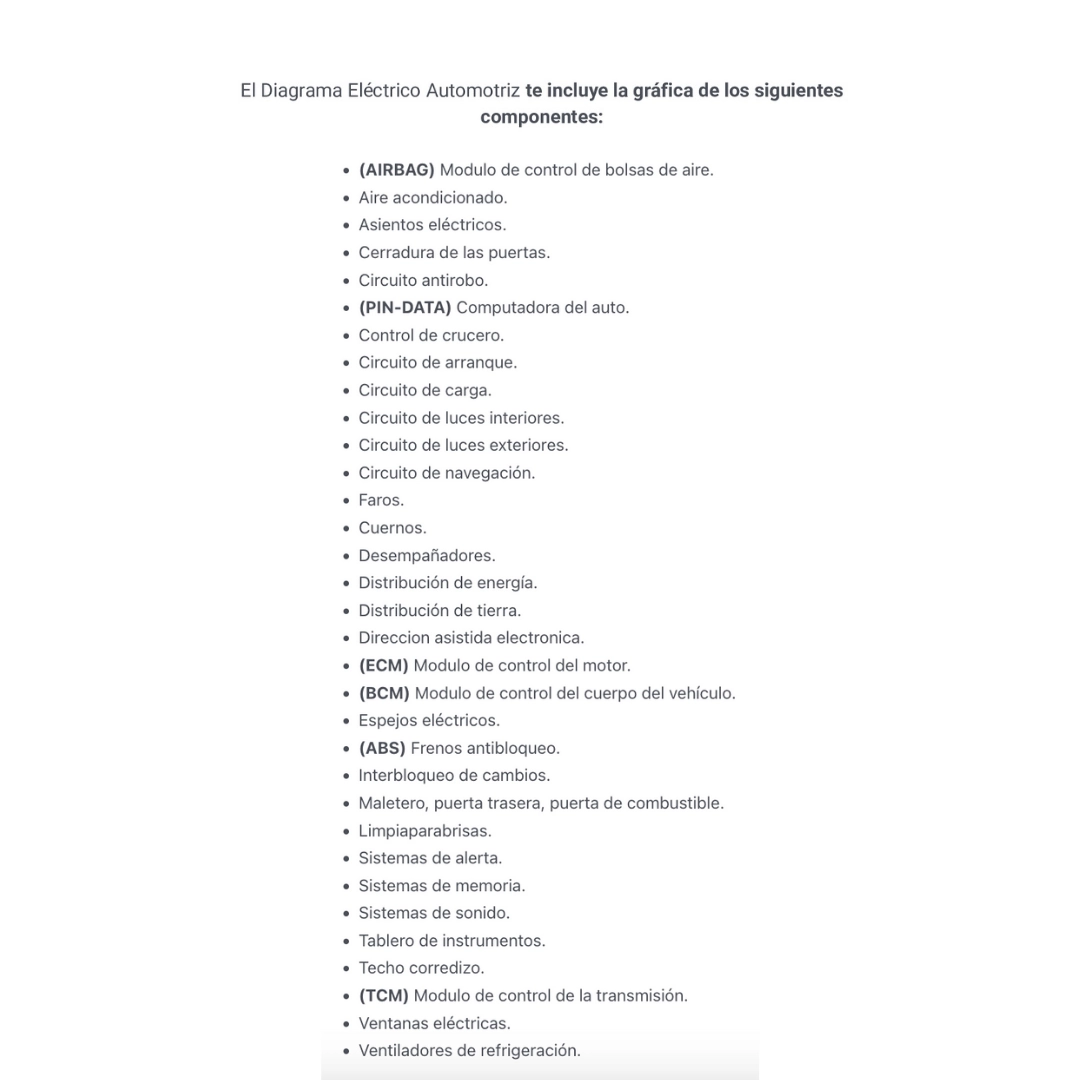 El Diagrama Eléctrico Automotriz te incluye la gráfica de los siguientes componentes: